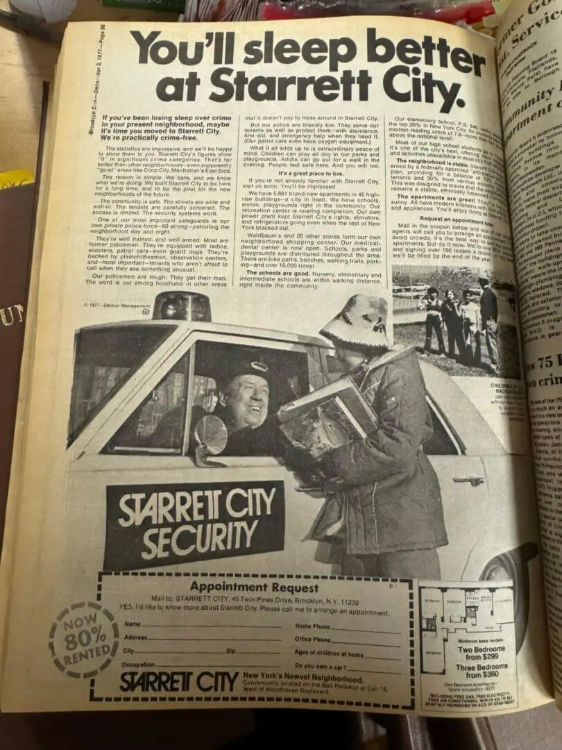 Advertisements to long forgotten department stores ran in the Sun, as well as one for SCT that stated, “You’ll sleep better at Starrett City” with 80% of the site rented.